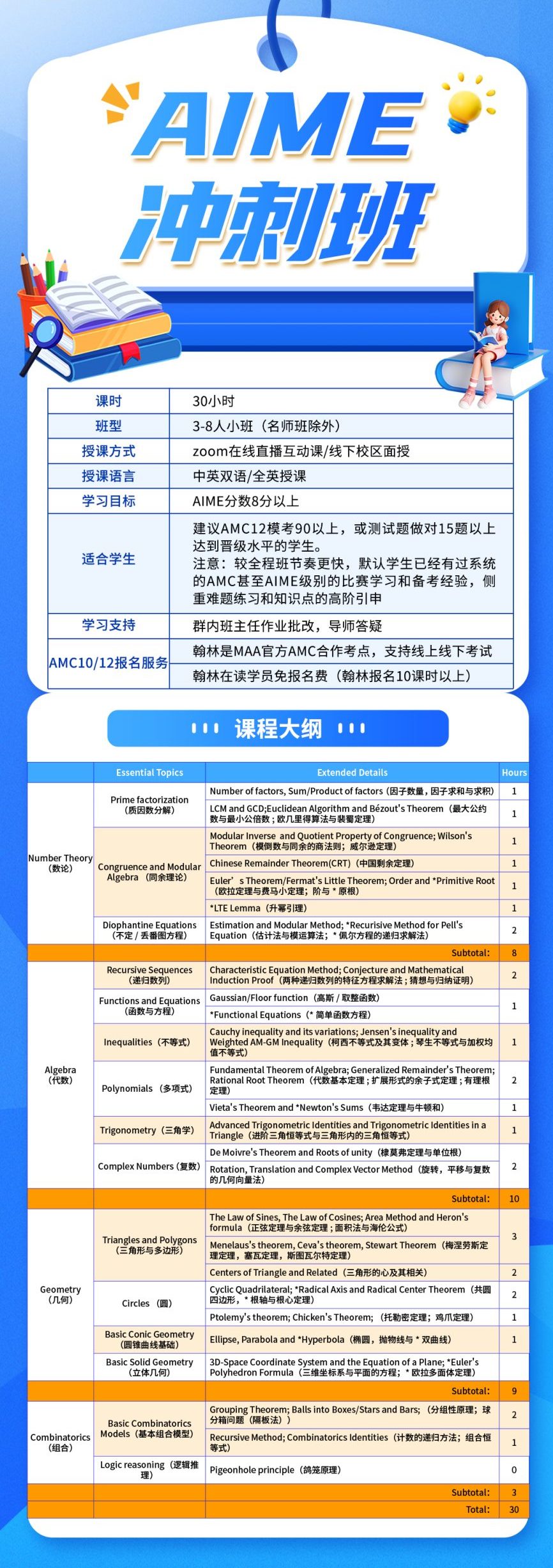 (2)较全程班冲刺班节奏更快,默认学生已经有过系统的AMC甚至AIME级