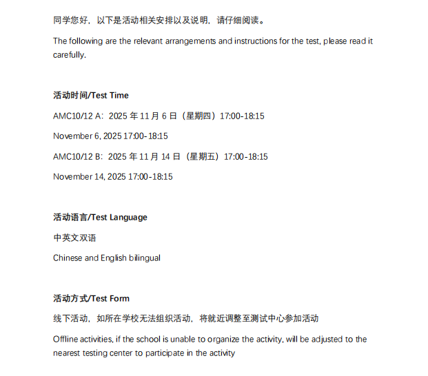 1、2025赛季AMC10/12的考试时间已正式公布:
